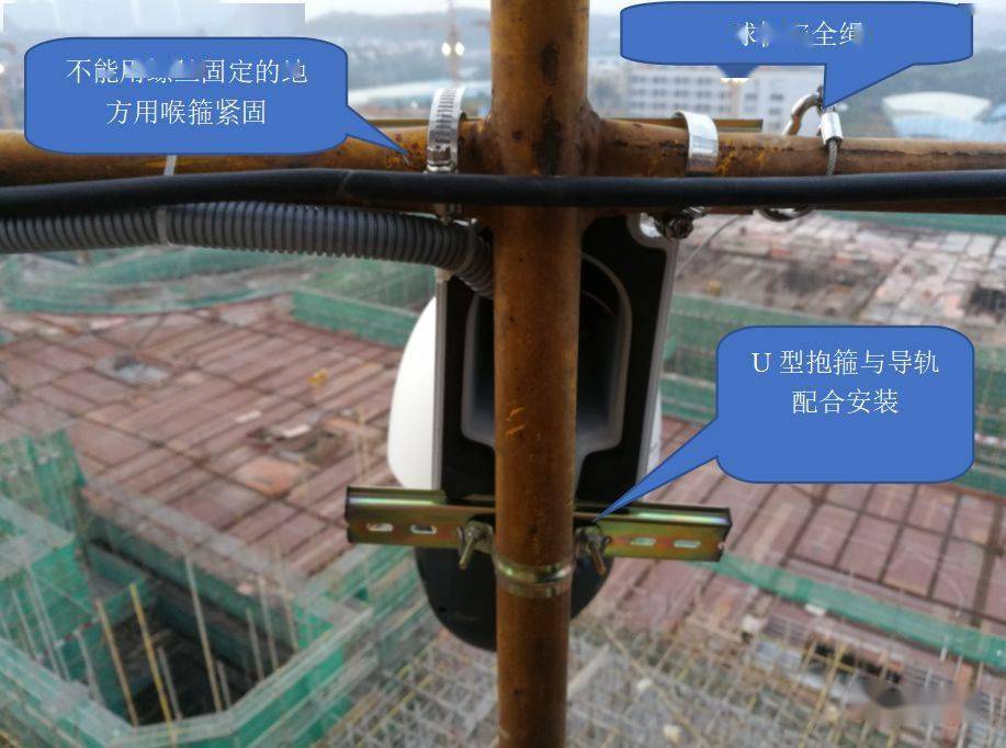 2、注意供电线缆和网络线缆严禁走活节内侧,这样布线的目的主要是防止塔吊在升高的过程中将电线夹断。